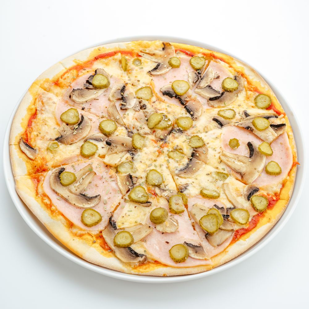 Соус для пицц, сыр, ветчина, шампиньоны, огурец маринованный , орегано