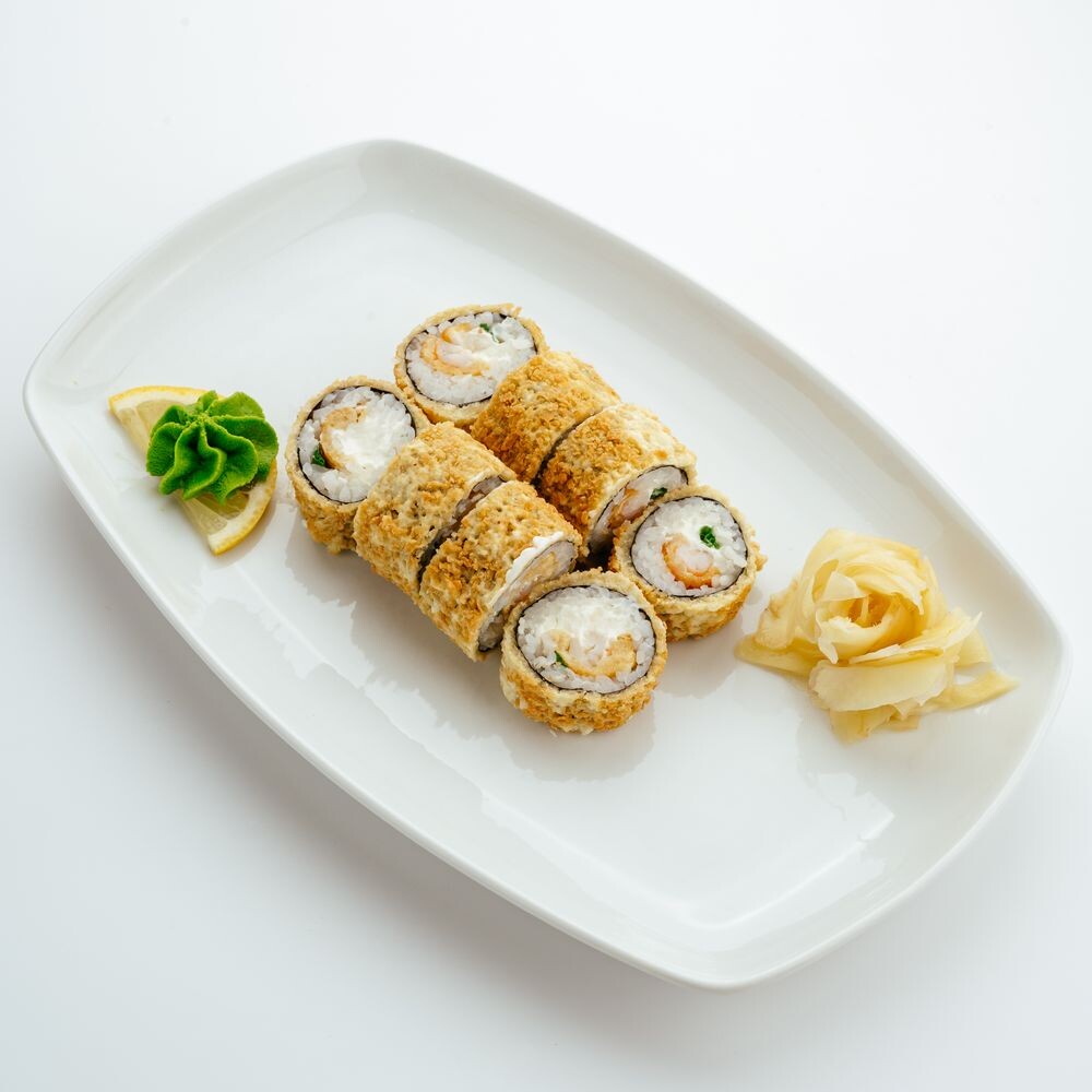 Рис, креветка, темпура, творожный сыр, зелёный лук, нори.